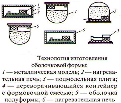 5) Литьё в оболочковые формы - модель вместе с подмодельной плитой нагревают до ~200 0С и засыпают формовочной смесью из кварцевого песка и термореактивной смолы. Слой смеси прилегающий к модели оплавляется, образуя корку толщиной 10 – 12 мм. Полученную форму упрочняют нагревом до ~350 0С, затем собирают, заформовывают в опоку и заливают металл. Применяют для точных отливок из любых металлов.