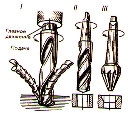 2) Сверление – выполняется спиральными, перовыми, центровочными и свёрлами глубокого сверления. Зенкерование – обработка резанием стенок отверстий. Различают зенкеры: для расширения отверстий, для получения цилиндрических и конических углублений, для зачистки торцевых поверхностей. Развёртывание – обработка стенок отверстий для получения высокой точности и чистоты поверхности. Виды станков – вертикально- и радиально сверлильные, расточные и специальные.
