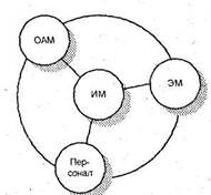 Соотношение всех четырех механизмов — организационно-административного (ОАМ), экономического (ЭМ), информационного (ИМ) и работы с персоналом — изображено на рис. 2. Система этих четырех механизмов является необходимой и достаточной для задания и реализации любого менеджмента. Достаточной — в том смысле, что других механизмов нет и не надо. Необходимой — в том смысле, что реальный менеджмент предполагает наличие и использование всех четырех механизмов. Отсутствие или бездействие хотя бы одного из них приводит к тому, что успешный менеджмент не состоится. Нет распределения полномочий — и не ясно, кто за что отвечает, кто что делает. Нет экономического механизма — и все превращается в безответственную и безосновательную игру административной воли. Нет компетентного ж мотивированного персонала — и все ресурсы и все усилия пойдут прахом. Не принимаются решения и планы, нет контроля и учета, необходимых документов — тем более не приходится говорить о менеджменте. Поэтому, чем бы вы ни собирались управлять — страной ли, отраслью ли,