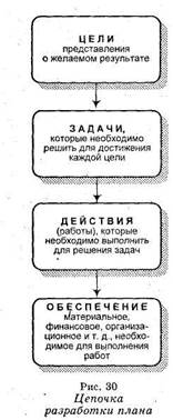 Целевое обоснование планов Существует несколько методик разработки целей на планируемый период. Однако, в принципе, разработка любого плана предполагает последовательное прохождение цепочки (см. рис. 30). Задача, таким образом, заключается в последовательном расписывании (декомпозиции) главных целей на задачи, которые необходимо решить для достижения целей. Задачи затем расписываются на направления и формы работы и т. д. вплоть до конкретных операций с требуемой степенью конкретизации. Графически эта процедура может быть представлена в виде древовидного графа — так называемого «дерева целей», напоминающего перевернутое дерево, последовательное прохождение по «ветвям» которого сверху вниз дает представление о конкретизации целей работы на планируемый период. МЕНЕДЖМЕНТ В СФЕРЕ КУЛЬТУРЫ Главной проблемой при этом является формулировка целей. Следует помнить, что цель — это конкретное описание желаемого результата. Поэтому для формулировки целей не могут использоваться глаголы или отглагольные существительные типа «улучшить» («улучшение»), «расширить» («расширение»), «увеличить» («увеличение») и т. п. Методики целевого обоснования различаются, прежде всего, по источнику формулировки целей/Таким источником могут быть организационные документы — уставы, положения и инструкции, нормативные документы, положения которых используются в качестве формулировки целей (уставные цели и задачи, виды деятельности, функциональные обязанности). Цели могут браться из директивных и распорядительных документов (приказов, распоряжений, постановлений). В простейшем случае конкретного тематического плана в качестве цели может фигурировать конкретная форма работы, план подготовки и проведения которой разрабатывается (рис. 31). Каждая из этих1 позиций может быть при необходимости еще более детализирована, и итогом такой проработки может стать конкретный сценарный план. В качестве целей могут использоваться также нормы и нормативы, в том числе целевые, о которых шла речь выше. Во всех этих случаях цели как бы задаются «сверху». В случае же отсутствия нормативно или директивно заданных целей, последние могут быть выведены, получены аналитически в результате осмысления предшествующего