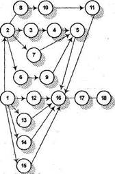 Нумерация работ в перечне практически никакой роли не играет. Главное на этом этапе — не пропустить ни одной из необходимых операций (см. табл. 11). Характер и масштаб членения планируемой работы на- операции полностью зависят от кадровых возможностей, масштабов планируемой работы, накопленного опыта. 2 этап: упорядочение работ в зависимости от их последовательности (вычерчивание сетевого графика). Сетевой график представляет собой графическое изображение упорядочения запланированных в перечне операций — структуру, состоящую из кружков' с цифрами и соединяющих, их стрелок. Сетевой график может вычерчиваться по двум методикам. Согласно первой кружки с цифрами соответствуют работам по перечню, а стрелки — их последовательность. Согласно второй — наоборот: работам соответствуют стрелки, а кружки с цифрами — их последовательности. У каждой из методик имеются свои достоинства, но в данной работе описывается первая методика. МЕНЕДЖМЕНТ В СФЕРЕ КУЛЬТУРЫ Та б л й ца 11 Пример перечня операций для сетевого плана