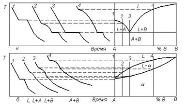 Основными методами, используемыми для построения диаграмм состояния, являются: термический, микроструктурный и рентгеноструктурный методы. К числу дополнительных методов относятся дюрометрический, включающий исследование микротвердости структурных составляющих, механических свойств, определение электропроводности, теплопроводности, дилатометрический и магнитный методы, а также применение радиоактивных изотопов. Наиболее наглядным и простым методом построения диаграмм состояния является термический метод, заключающийся в исследовании кинетических кривых охлаждения сплавов различных составов. Наблюдая по пирометру изменение температуры при медленном охлаждении металла, и откладывая на графике это снижение температуры в зависимости от времени, получают серии кривых для каждого из сплавов исследуемых систем (рисунок 3.2).