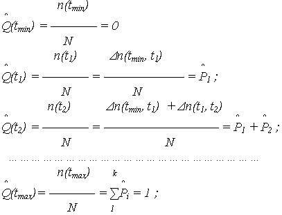 2.2.2. Расчет эмпирических функций Используя данные сформированного статистического ряда, определяются статистические оценки показателей надежности, т. е. эмпирические функции: - функция распределения отказов (оценка ВО)