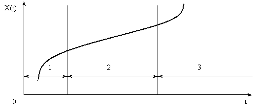 характеризует накопление необратимых изменений в результате старения, изнашивания или разрегулирования. Это слагаемое в (3) может быть очень большим. Следует отметить, что в практике эксплуатации даже при наличии встроенных или переносных средств контроля не всегда удается часто измерять значения ОП отдельных объектов. Поэтому реализации Хj (t), построенные по экспериментальным данным для моментов ti (i = Изменение ОП в зависимости от времени или наработки можно в общем случае представить тремя периодами (рис. 1). Первый период - приработка объекта. К концу этого периода скорость износа становится постоянной. Обычно в процессе приработки происходит уменьшение скорости износа, однако, хотя и реже, встречаются случаи возрастания скорости до стационарного значения. Серьезные фирмы-производители для повышения надежности и конкурентоспособности изделий осуществляют приработку на заводах, поэтому объект может иметь постоянную скорость износа с начала эксплуатации. Второй период характеризует основной период эксплуатации, при этом достигнутая к концу приработки скорость износа сохраняется примерно постоянной. Третий период - период "старения" объекта. Возможности существования объекта исчерпываются. Скорость изменения ОП катастрофически растет. Соотношение скорости износа при приработке и основной работе может служить показателем эффективности производства или качества материалов.