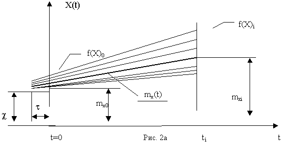 Тип модели линейной функции Х(t) или ln X(t) зависит от числа случайных аргументов, определяющих ее случайный характер. Веерная функция с ненулевым начальным рассеиванием описывается: - для процесса X(t)