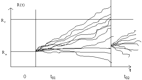 Помимо рассмотренных параметров, определяющих работоспособность объектов, во многих технических устройствах имеются характеристики, которые можно периодически регулировать, т.е. устанавливать равными номинальным значениям. Среди нескольких регулируемых характеристик объекта можно выбрать основную, которая является мерой его качества и определяет необходимость проведения профилактических работ. По аналогии с нерегулируемым ОП назовем эту характеристику регулируемым ОП (РОП). При проведении технического обслуживания РОП в момент времени t01 устанавливается равным некоторому неслучайному номинальному значению R0. При дальнейшей эксплуатации объекта РОП случайно изменяется, что можно представить полюсной случайной функцией времени R(t), все реализации которой проходят через одну неслучайную точку - "полюс" (R0, t01). При очередном техническом обслуживании в момент времени t02 у всех