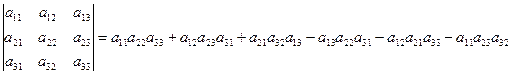 Для запоминания этого определения существует простое правило, которое называется «правилом треугольников». Каждое слагаемое, стоящее в правой части со знаком плюс, представляет собой произведение трех элементов определителя, взятых, как показано на схеме 1. Каждое слагаемое, стоящее со знаком минус, представляет собой произведение трех элементов определителя, взятых, как показано на схеме 2. Схема 1 Схема 2