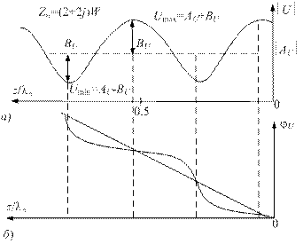 Рис. 1.13. Эпюры напряжения в линии с отраженной волной: а) – амплитуды; б) – фазы
