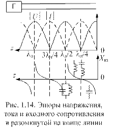 Замкнутая линия. В этом случае напряжение на нагрузке равно нулю (U н = 0), поэтому напряжение, ток и входное сопротивление в линии принимают вид: U = jI н W sin(b z), I = I нcos(b z); Z вх =U / I = jW tg(b z) = - jX вх. (1.23)
