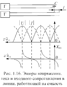 Используя результаты предыдущего раздела, нетрудно самостоятельно сделать выводы о трансформирующих свойствах коротко-замкнутой линии. Отметим лишь, что в замкнутой линии также устанавливается режим стоячей волны. Отрезок короткозамкнутой линии, длиной меньше lл / 4, имеет индуктивный характер входного сопротивления, а при длине lл / 4 такая линия имеет бесконечно большое входное сопротивление на рабочей частоте. Это свойство короткозамкнутого четвертьволнового отрезка линии позволяет использовать его в практических устройствах как «металлический изолятор». Линия, нагруженная на емкость. Как следует из анализа работы разомкнутой линии, каждой емкости С на данной частоте «можно поставить в соответствие отрезок разомкнутой линии длиной меньше lл / 4. Емкость С имеет емкостное сопротивление jXC = j / w С. Приравняем величину этого сопротивления к входному сопротивлению разомкнутой линии длиной l < lл / 4: - j / w С = - jW ctg(b l). Отсюда находим длину линии l, эквивалентную по входному сопротивлению емкости С: l = (l / b)arctg[w CW ]. Зная эпюры напряжения, тока и входного сопротивления разомкнутой линии, восстанавливаем их для линии, работающей на емкость (рис. 1.16). Из эпюр следует, что в линии, в этом случае, устанавливается режим стоячей волны. При изменении емкости эпюры сдвигаются вдоль оси z. В частности, при увеличении емкости емкостное сопротивление уменьшается, напряжение на емкости падает, и все эпюры сдвигаются вправо, приближаясь к эпюрам, соответствующим короткозамкнутой линии. При уменьшении емкости эпюры сдвигаются влево, приближаясь к эпюрам, соответствующим разомкнутой линии.