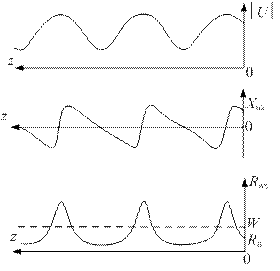 Рис. 1.19. Эпюры напряжения и входного сопротивления в линии нагруженной на активное сопротивление Зависимости R вх и X вх от z для случая R н > W приведены на рис. 1.19. Здесь же представлена соответствующая эпюра напряжения. Из эпюр следует, что при увеличении сопротивления нагрузки они приближаются к эпюрам, соответствующим линии, разомкнутой на конце. Следует обратить внимание на поперечные сечения линии z 1 и z 2, в которых активная часть входного сопротивления линии равна волновому сопротивлению W. а реактивная часть имеет емкостный в точке z, или индуктивный в точке z 2 характер. Поперечные сечения линии с такими входными сопротивлениями периодически повторяются через lл / 2. Из эпюр также следует, что в сечениях линии, в которых напряжение достигает максимума или минимума, входное сопротивление чисто активное. Это остается справедливым и для случая R н < W.