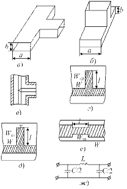 Рис. 2.15.Шлейфы: а – параллельный волноводный; б – последовательный волноводный; в – параллельный коаксиальный; г – параллельный полосковый разомкнутый; д – параллельный полосквый короткозамкнутый; е – последовательный полосковый; ж – эквивалентная схема последовательного полоскового шлейфа