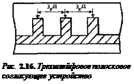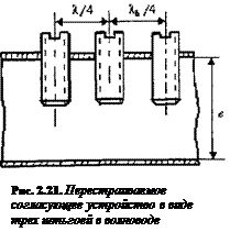 Реактивный штырь представляет собой металлический цилиндр небольшого диаметра, размещаемый в поперечном сечении волновода параллельно или перпендикулярно силовым линиям электрического поля. В зависимости от расположения штыря в поперечном сечении волновода и его размеров на эквивалентной схеме он может быть представлен индуктивностью пли емкостью. На рис. 2.20 представлены реактивные штыри в волноводе и их эквивалентные схемы. Значения номиналов элементов эквивалентных схем штырей определяются по формулам, имеющимся в справочной литературе. При неглубоком погружении штыря в волновод параллельно силовым линиям электрического поля он эквивалентен емкости (рис. 2.20, б). Такие штыри используются в перестраиваемом согласующем устройстве, эквивалентном трехшлейфовому согласователю (рис. 2.21). Недостаток емкостных штырей состоит в том, что они снижают электрическую прочность тракта.