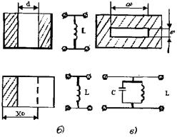 Четвертьволновые трансформаторы и шлейфы являются узкополосными согласующими устройствами. К широкополосным согласующим устройствам относятся ступенчатые и плавные переходы. На рис. 2.17. показаны варианты исполнения таких устройств на основе прямоугольных волноводов, коаксиалов и полосковых линий. Диафрагмы и реактивные штыри, применяемые для согласования в волноводных факта, также являются узко-полосными устройствами. Диафрагмой называется тонкая металлическая перегородка, частично закрывающая поперечное сечение волновода. Различают диафрагмы емкостные, индуктивные и резонансные. Их вид и эквивалентные схемы представлены на рис 2.18. Нормированные значения проводимости емкостной и индуктивной диафрагм определяются приближенными соотношениями ВС = (4 b /lв) ln(cosec(p d /2 b)cosec (p у 0/ b));
