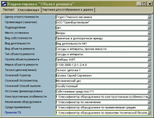 Режим Описание объекта предназначен для паспортизации и классификации объекта, содержит следующие вкладки: · Паспорт — содержит паспортные данные объекта ремонта. · Классификация — позволяет задать классификацию по: центру ответственности, организации, подразделению, месту установки, виду собственности, виду деятельности, виду объекта ремонта, типу объекта ремонта, группе объекта ремонта, марке объекта ремонта, технологической цепочке (линии), основному куратору, основному исполнителю, основному способу выполнения, источнику финансирования.