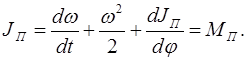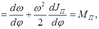 Воспользуемся известной формулой об изменении кинетической энергии, которая применительно к вращающему звену приведения формулируется так: дифференциал кинетической энергии вращающейся массы d T равен алгебраической сумме элементарных работ приведенных моментов d A д = M п.д dφ и d A с = M п.cdφ, т. е. d T = d А = (М п.д − М п.с)dφ = M п dφ. (1.25) Интегрированием уравнения (1.25) в пределах от φо до φ Т φ ∫ d T = ∫ M пdφ = A, То φо получаем уравнение движения механизма в форме закона об изменении кинетической энергии: φ Т − Т 0 = J п ω2 /2 – J п0 ω 02 /2 = ∫ М п dφ = А, (1.26) φо φ φ φ где А = А д − А с или ∫ М пdφ = ∫ М п.д − ∫ М п.сdφ − φо φо φо суммарная работа приведенных моментов за время, соответствующее изменению обобщенной координаты от φо до φ. Запишем уравнение (1.25) в несколько другом виде: d = (J п ω 2/2) = M п dφ или (d /dφ) (J п ω 2/2) = M п. (1.27) Дифференцированием (J п = ω2/2) как функции двух независимых переменных (J п и ω) находим уравнение движения механизма в дифференциальной форме: J п ω С помощью уравнения (1.26) можно определить условия, необходимые для осуществления трех режимов работы механизмов: разбега, выбега и установившегося движения (рисунок 1.31). Представим (условно) левую часть уравнения (1.26), т. е. приращение кинетической энергии звена приведения, как работу сил инерции (отрицательную при ускоренном движении и положительную при замедленном), тогда уравнение (1.26) можно интерпретировать как уравнение энергетического баланса − соотношение работ или мощностей всех сил, действующих на механизм в данном положении: А д − А с ± А и = 0. (1.29) При разбеге механизма (ускоренное движение) работа сил инерции, так же как и сил сопротивления, отрицательна, поэтому уравнение (1.29) принимает вид А д − А с = А и > 0 или А д > А с. (1.30) При выбеге (замедленное движение), наоборот, работа сил инерции положительна, поэтому А д − А с = − А и < 0 или А д < А с . (1.31)