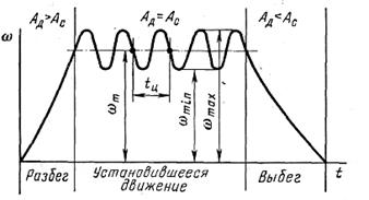 При установившемся движении кинетическая энергия, равно как и угловая скорость звена приведения, изменяется (периодически) только в пределах цикла (рисунок 1.31), за весь же цикл или за период t = kt ц (t ц − время одного цикла, k − целое число циклов) среднее значение кинетической энергии Т m остается постоянным, а ее приращение ∆ Т m = 0 и соответствующая работа сил инерции А и = 0. В этом случае А д − А с = 0 или А д = А с. (1.32) Полученные соотношения работ движущих сил и сил сопротивления являются необходимыми условиями работы механизма в режимах разбега, выбега и установившегося движения соответственно. В режиме установившегося движения работают многие технологические и энергетические машины (например, металлорежущие станки, электрические генераторы). Работа же многих приборов и автоматических систем совершается во время разбегов (в течение времени срабатывания), чередующихся с выбегами.