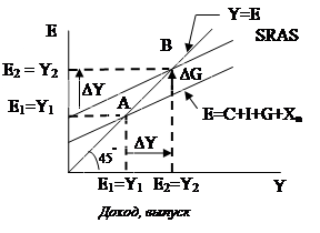 Так как равновесный уровень национального производства может быть достигнут вне состояния полной занятости ресурсов (вследствие неэффективности совокупного спроса), то образовавшийся разрыв может быть аннулирован с помощью инструментов государственного регулирования экономики: изменения величины государственных расходов G и налоговых отчислений в госбюджет Т.