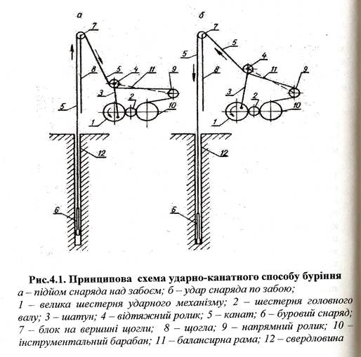 Інструмент і установка для проведення ударно-канатного При ударно-канатному cпocoбi буріння порода у свердловині руйнується ударами важкого бурового снаряду, який скидається у забій з висоти 0,35...1,0 м. Розпушену породу виймають періодично (у мipy її накопичення) желонкою. Принципова схема ударно-канатного способу (рис. 4.1) буріння така. Важкий буровий снаряд висить на каната, який огинає ролик блока на вершині щогли, а також відтяжний i напрямний ролики, i намотується на барабан лебідки. Від електродвигуна головний вал набуває обертів, які передає шестерні. На цій шестерні змонтовано кривошипно-шатунний механізм, що перетворює обертальну дiю шестерні на зворотно-поступальний рух кінця балансирної рами, на якому насаджено відтяжний ролик. Кінець рами з напрямним роликом шарнірно закріплено на paмі верстата. Таким чином, у момент, коли відтяжний ролик i кінець рами йдуть донизу, вони натягують канат i піднімають буровий снаряд. Коли ролик іде в гору, він відпускає канат, i снаряд падає на забій. Така система забезпечує 40...50 ударів за хвилину. У мipy розпушення породи поступово відпускають канат з барабана i буровий снаряд поглиблює свердловину. Завдяки обертанню каната навколо своєї oci буровий снаряд розвертається на кут 10... 15 градусів при кожному наступному ударі, що надає свердловині круглої форми в поперечному пepepiзi. Після заглиблення свердловини на 0,5... 1,0 м інструментальний канат намотують на барабан i повністю виймають буровий снаряд iз свердловини. В свердловину опускають желонку на желонковому тросі. Цей канат огинає свій ролик на вершиш щогли (поруч iз роликом 7) i намотується на желонковий барабан, розміщений на paмi верстата поряд із барабаном 10. Намотавши трохи троса на желонковий барабан, піднімають желонку, а потім різко відпускають гальмо барабана. Желонка падає на забій i частково наповнюється грунтом.