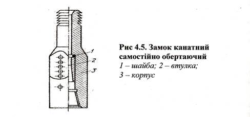 Вони можуть бути додатково обладнані ножем - загостреною планкою, яка прикріплена до нижньої частини башмака. Желонки з напівсферичним клапаном i списом (рис. 4.8в) застосовують, в основному, для вилучення iз свердловини шламу при бурінні в пісках, супісках. "Спис" в нижній частині напівсферичного клапана забезпечує йому необхідний напрямок i хід. "Спис" полегшує вивільнення желонки від шламу на поверхні. Для очистки свердловини від шламу на желоночному канаті в свердловину опускають желонку i вільно скидають її на забій з висоти 3...5 м. При ударі на забій клапан відкривається i зруйнована порода потрапляє в середину желонки. При підйомі желонки клапан закривається i втримує породу. Ці операції повторюються 5-8 разів, щоб желонка заповнилась породою, а потам її піднімають на поверхню i опорожнюють. Бypoвi стакани застосовують при бурінні м'яких, липких глин. Стакан - це сталева труба з башмаком ріжучої дії на нижньому кінці, дужкою з різьбовою головкою на верхньому та вікнами по довжині. Така желонка не має ніякого клапана в нижній частині. Для буріння в пливунах або водоносних пісках застосовують поршневі желонки (рис. 4.8г). Всередині поршневої желонки знаходиться поршень iз штоком. В поршні є отвори, які перекриваються шкіряною або гумовою манжетами, для пропуску води або повітря. Башмак має вирізи для засмоктування розрідженої породи i плоский клапан. При піднімання вверх, в корпусі желонки створюється вакуум, клапан відкривається i в желонку засмоктується розріджена порода. Канати при ударно-канатному бурінні служать для передачі руху боровому снаряду або желонці при бурінні чи очистці свердловини, а також для опускально - підйомних операцій. У відповідності з цим розрізняють канати інструментальні (бурильні), желоночні i талевi.