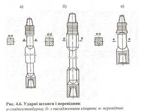 Канат вставляється в корпус, проходить через шайбу i втулку, кінці його розпушуються, завертаються в зворотному напрямку, утворюють таку грушу, потім витягаються назад i заклинюється у втулці. Таким чином при ударі шайба i втулка йдуть до низу, напруга на канат зменшується, він трішечки скручується, повертає шайбу i втулку на невеликий кут. При наступному піднятті шайба i втулка прижимаються к корпусу в новому місці, а тому при вилученні снаряду iз породи він повертається на цей кут. Для збільшення маси бурового снаряду i запобігання викривлення свердловини використовують штанги ударні (рис.4.6). Гладкостовбурні штанги мають довжину 3, 4, 6м i масу від 303 до 1290кг, а з висадженими кінцями більш легкі, мають масу 270...910 та довжину 4, 6м. Маса збільшується iз збільшенням номінальних poзмірів різьби головки.