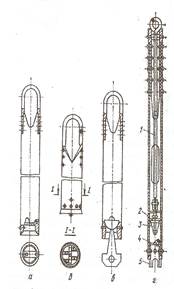 Рис.1.9. Желонки. а- з плоским клапаном; б- з двостворним клапаном; в – з напівсферичним клапаном; г – поршнева: (1-шток; 2-манжета поршня; 3-поршень; 4-клапан; 5-башмак)