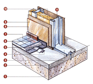Например, из полимерно-битумной мембраны Fonostop Duo (фирма INDEX), технической пробки толщиной до 8 мм от фирмы IPOCORC или листов "Регупол", выполненных из резиновой крошки и полиуретана ("РЕГУПЕКС"). Сверху делают бетонную стяжку толщиной 30-50 мм, а на нее настилают чистовое напольное покрытие. За счет малого модуля упругости материала подложки распространение ударного шума резко падает. KNAUF предлагает свой шумоизоляционный "пирог". Различные комбинации его слоев в сочетании с листом полистирола толщиной 20-30 мм позволяют изменить индекс Lnw на 20-30 дБ для вибраций с частотой 150-3000 Гц. В среднем "плавающий" пол способен уменьшить этот индекс на 8-33 дБ для наиболее распространенных в быту шумов с частотами от 150 до 3000 Гц. Настил линолеума снижает индекс приведенного ударного перекрытия на 10-15 дБ Однако при настиле линолеума с войлочной основой непосредственно на железобетонную плиту толщиной 220 мм изоляция шума нередко ухудшается на 1-3 дБ. Это связано с резонансными явлениями. В многоэтажных зданиях для борьбы с ударным шумом всегда применяют прокладочный материал. С его помощью защищают стыки несущих элементов. Довольно эффективно рулонное кремнеземное волокно Supersil толщиной 6 мм. По данным НИИСФ, оно позволяет снизить индекс Lnw на 27 дБ. Волокно универсально, поскольку отличается еще и хорошим звукопоглощением. В качестве прокладочного материала удобно использовать также синтетическую ленту "Регупол".