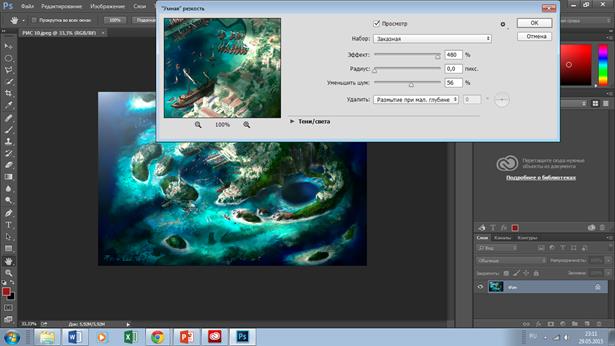 1) Открываем Photoshop CC. С помощью вкладки “Файл” открываем нужную картинку. Вкладка фильтр - усиление резкости - Умная резкость.