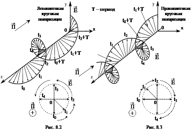 Круговая поляризация может быть получена суммированием двух ЭМВ ортогональных линейных поляризаций с равными амплитудами. Верно и обратное свойство: эллиптически или линейно поляризованную ЭМВ можно получить суммированием двух волн с круговой поляризацией и противоположными направлениями вращения (рис. 8.4).