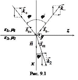 ЭМ явления на границе раздела двух сред играют большую роль в теории ЭМП. Границу раздела считаем плоской и бесконечно протяженной, что позволяет рассматривать ЭМВ в виде лучей (приближение геометрической оптики). Считаем, что оси y и z лежат в плоскости границы раздела сред (рис. 9.1), а ось x совпадает с направлением вектора нормали Наклонное падение ЭМВ. Законы Снеллиуса. Направление распространения падающей ЭМВ определяется ортом Волновой вектор распространения для падающей ЭМВ имеет вид Волновые векторы падающей, отраженной и преломленной волн соответственно равны При заданном угле падения φ определим угол отражения φ – (отраженный луч) и угол преломления Векторы ЭМП этих трех волн должны удовлетворять граничным условиям во всех точках плоскости границы раздела в любой момент времени, поэтому фазовые множители данных ЭМВ совпадают: