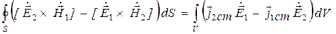 Соотношения (11.17) и (11.18) – это соответственно дифференциальная и интегральная формулировки леммы Лоренца, устанавливающей важные связи между полями двух источников. В случае свободного пространства в дальней зоне источников (S ®∞) левая часть соотношения (11.18) стремится к нулю [1, 5, 6], а это приводит к таким соотношениям: