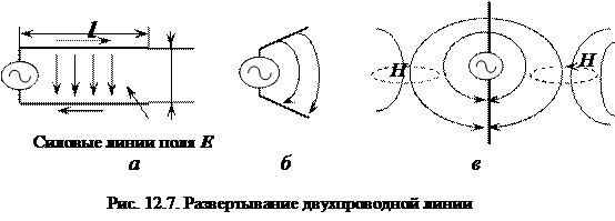 При анализе апертурных антенн (зеркальные и т. п.) итоговое ЭМП получается как суперпозиция ЭМВ, создаваемых излучателями Гюйгенса, с заданными электрическими и магнитными полями на них. Излучающие и неизлучающие системы. Представим себе отрезок разомкнутой на одном конце двухпроводной линии длины l, подключенной на другом конце к генератору синусоидальных колебаний частоты w (рис. 12.7а). Поперечные размеры линии выбраны так (