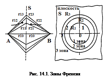 При распространении ЭМВ в свободном пространстве области пространства по-разному влияют на формирование ЭМП на входе приемника. Областью пространства, существенной при распространении ЭМВ, называют область, в которой распространяется основная часть передаваемой мощности. Эта область охватывает пространство вблизи прямой, соединяющей точки расположения излучателя и приёмной антенны. Конфигурацию существенной области определяют исходя из принципа Гюйгенса – Френеля. Пусть в точке А помещен источник ЭМВ, а в точке В – приемная антенна (расстояние АВ много больше l). На некотором расстоянии от точки А помещена бесконечная плоскость, перпендикулярная к линии АВ (рис. 14.1). Эту плоскость рассматривают в качестве поверхности вторичных источников ЭМП и разбивают на зоны Френеля. Полное ЭМП в точке приема определяется суммированием элементарных вторичных ЭМП на плоскости S. Границы зон Френеля определяются как