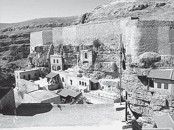 Эта обитель еще издали заметна двумя массивными башнями; соединенные высокой стеной, они кажутся висящими над бездной. Проехав по крутому контрфорсу, странник достигал небольшой железной дверцы, устроенной за угловой башней в западной стене монастыря. Только через эту дверь и можно проникнуть в лавру Саввы Освященного.
