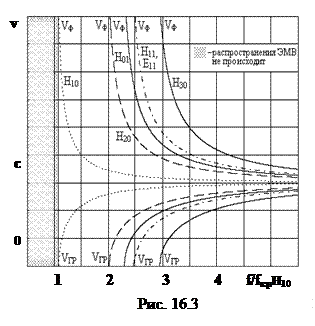 Таким образом, основным типом волн в прямоугольном волноводе является мода Н10 , имеющая наименьшую критическую частоту. Если Из (16.3)–(16.5) и рис. 16.3 следует, что распространяющаяся в прямоугольном волноводе ЭМВ имеет существенную дисперсию, что может привести к значительным искажениям передаваемого сигнала.