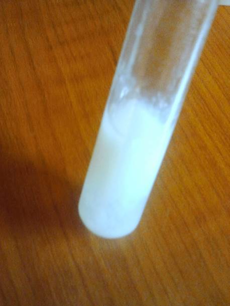 Далее содержимое второй пробирки я смешала с содержимым первой пробирки. В результате смешивания в первой пробирке сразу образовался осадок – апатит. Осадок по структуре напоминал небольшие кристаллы.