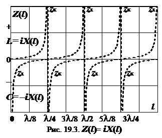 На рис. 19.3 для обоих случаев показаны графики сопротивлений, из которых видно, что на отрезке ЛП длиной l/2 Z (l) принимает любые значения от – ¥ до ¥.