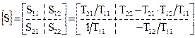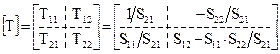 При каскадном соединении многополюсников итоговая матрица рассеяния не может быть получена простым перемножением матриц БЭ. В этом случае удобно использовать матрицу передачи (T-матрицу), которая не имеет данного недостатка. При расчетах каскадного соединения четырехполюсников с матрицами передачи [T1][T2],…,[Tn] результирующая матрица передачи равна произведению их матриц передачи: [TS]=[T1]×[T2]×…×[Tn]. Элементы [S] и [T] матриц связаны так [37]: