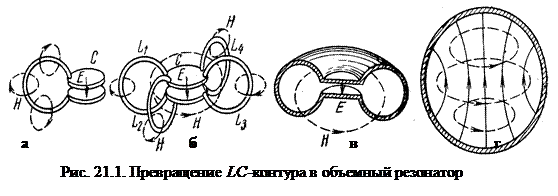 Простейшим ЭМ резонатором является колебательный LC -контур. Переход от электрического поля к магнитному сопровождается в нем пространственным перемещением энергии из конденсатора в индуктивность. Уже в ОВЧ диапазоне контур работает неудовлетворительно: снижается допустимая мощность, сказываются индуктивности выводов, межвитковые емкости катушки и т. д. [2]. В УВЧ диапазоне и выше применяют объемные резонаторы, ЭМ колебания которых возникают внутри ограниченного объема. На рис. 21.1 показано постепенное превращения LC -контура в объемный резонатор. К контуру из одного витка (рис. 21.1а), рассчитанному на ОВЧ, добавляем параллельно несколько витков (рис. 21.1б), что уменьшает излучение в пространство и повышает частоту контура. Объединение всех витков в сплошную поверхность приводит к тороидальному резонатору, ЭМП которого полностью локализовано в объеме резонатора (рис. 21.1в). Этот резонатор относится к классу квазистационарных, имеет четко выраженные области существования электрических и магнитных полей, его размеры малы по сравнению с l собственных колебаний. Раздвинув пластины конденсатора (рис. 21.1б,в), получим сферическую поверхность. Собственная l такого резонатора станет сравнимой с его размерами. Весь объем резонатора (рис. 21.1г) будет в равной степени электрическим и магнитным полями, и в этом случае не удается выделить отдельные области со свойствами индуктивности и емкости. ЭМ колебания могут существовать в ограниченном объеме любой формы, если размеры объема достаточно велики по сравнению с l. ЭМП в таком резонаторе можно представить в виде ЭМВ, вектор которой последовательно отражается от его стенок. Резонанс (резкое увеличение амплитуды колебаний) наблюдается в том случае, если эта ЭМВ приходит в определенную точку в одной и той же фазе. Собственные колебания возникают в резонаторе при внешнем импульсном воздействии. Частота резонанса зависит от геометрических размеров резонатора и структуры ЭМП рассматриваемого типа волн. Объемные резонаторы имеют бесконечный ряд резонансных частот, соответствующих собственным колебаниям разного вида. (Путей для циркулирующего в резонаторе вектора ЭМВ, для которого выполняются условия резонанса, - бесконечное множество!) Вынужденные колебания возникают в резонаторе при внешнем периодическом воздействии, при этом энергия в систему поступает каждый период. При совпадении частоты этого воздействия с одной из резонансных частот возникает резонанс. Добротность резонатора определяется как отношение запасенной в резонаторе колебательной энергии к энергии потерь в резонаторе. Отрезок полого металлического волновода прямоугольного сечения, на концах которого расположены металлические пластинки, образует прямоугольный параллелепипед со сторонами a, b и l по осям (рис. 21.2). Этот пример показывает, как из отрезков закрытых ЛП получаются закрытые объемные резонаторы.