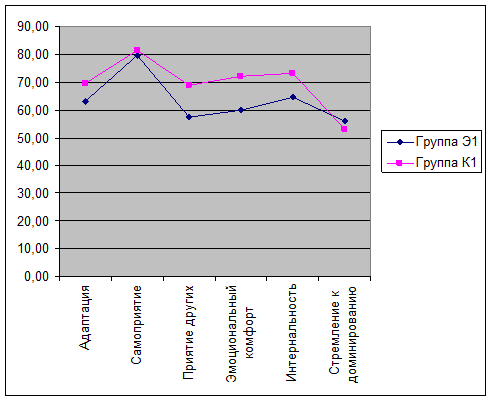 Как можно видеть, форма обоих графиков (личностный профиль) практически совпадает. Из всех критериев адаптированности в обеих группах наиболее высоким является самопринятие. В группе Э1 наиболее низким показателем является принятие других, в группе К1 – стремление к доминированию. Внутри шкал – критериев адаптации обнаружены следующие двусторонние парные корреляции по критерию Пирсона (достоверность р = 0,01): 1) положительная корреляция между самопринятием и эмоциональным комфортом; 2) положительная корреляция между самопринятием и доминантностью; 3) положительная корреляция между интернальностью и эмоциональным комфортом; 4) положительная корреляция между эмоциональным комфортом и доминантностью; Корреляция шкалы адаптации с прочими шкалами не рассматривается ввиду наличия общих вопросов, одновременно входящих в шкалу адаптации и прочие шкалы. Следует отметить, что корреляционный анализ применительно к данной работе может не обладать достаточной валидностью ввиду малого объема выборки.
