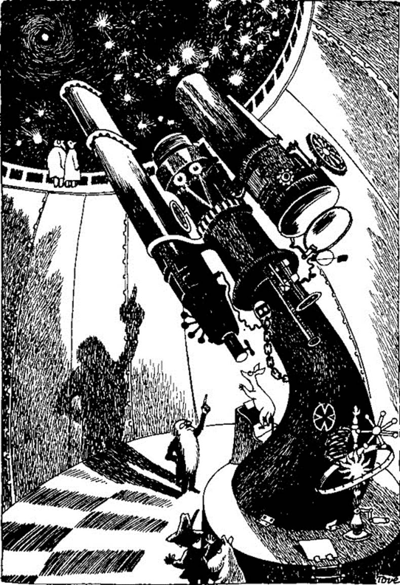 – Обережно, – тихо застеріг Нюхмумрик. – Це тут. Вони нахилилися і зазирнули до тісної розколини, на дні якої в останніх відблисках дня мерехтіли міріади червоних камінців – безліч крихітних комет у чорному всесвіті… – І все це належить тобі? – затамувавши подих, прошепотів Чмих. – Так, доки я тут мешкаю, – голос Нюхмумрика звучав безтурботно. – Мені належить усе, що я бачу і що тішить моє око. Усенька Земля, якщо хочеш… – А собі можна щось узяти, як гадаєш? – очиці Чмиха мрійно блищали. – За них можна купити собі вітрильник або самокат… – Бери, скільки хочеш! – засміявся Нюхмумрик. Чмих почав обережно спускатися у розколину. Він подряпав носа і кілька разів ледь не зірвався вниз, але вперто прокладав собі шлях. Опинившись урешті на дні, важко перевів дух і заходився тремтячими лапами згрібати ґранати. Що там перли Мумі-троля у порівнянні з цією розкішшю! Мерехтлива купка невпинно росла. Чмих, онімілий від щастя, відходив усе далі вглиб ущелини, підбираючи коштовності. – Агов! – долинув згори голос Нюхмумрика. – Ти довго там будеш порпатися? – Ще трішки! – закричав у відповідь Чмих. – Їх тут ще так багато… – Впала роса і стає холодно, – кликав Нюхмумрик. – Так-так. Вже йду… зараз… – відзивався Чмих, заходячи тим часом ще глибше в ущелину, де мерехтіли два великі червоні ґранати. І тут сталося щось жахливе: ґранати ворухнулися, кліпнули, підступилися ближче, а за ними з’явилося лускате тіло, що з шерехом, від якого холонула душа, пересувалося по камінні. Чмих верескнув лише раз, вмить розвернувся і кинувся навтьоки. Він побіг підстрибом, сторчголов, риссю, галопом до прямовисної стіни ущелини, а тоді подряпався вгору, чіпляючись змокрілими від страху лапками. Створіння під ним унизу тихо й погрозливо сичало. – Що на тебе найшло? – чудувався Мумі-троль. – Куди так поспішаєш? Чмих не відповідав, безтямно дерся угору, і, лише опинившись у безпеці, упав знесилений до ніг друзів. Мумі-троль з Нюхмумриком зазирнули вниз, у розпадину, і побачили велетенську ящірку, яка чипіла над купою гранатів. – Клянуся своїм хвостом! – прошепотів Мумі-троль. Чмих сидів поряд і ридав. – Усе вже минулося, – заспокоював його Нюхмумрик. – Не плач, маленький друже! – Ґранати, – хлипав Чмих. – Жодного мені не дісталося! Нюхмумрик сів коло нього і приязно мовив: – Я знаю. Нелегко доводиться тому, хто прагне володіти речами, мати їх, носити за собою. Я лише милуюся ними, а коли подаюся в мандри, вони залишаються у моїй пам’яті. Замість тягати важкі тлумаки з маєтками, я насолоджуюся мандрівкою. – Я міг нести їх у наплічнику, – понуро бубонів Чмих. – Однак дивитися на коштовності – це одне, а відчувати їх на дотик і знати, що вони твої, – зовсім інше. Чмих звівся на ноги і голосно висякав носа. Над ущелиною западала темрява, мовчазні й трохи засмучені, друзі поверталися назад. З Нюхмумриком подорож стала набагато веселішою. Він виводив на губній гармонії пісеньки, яких вони ніколи раніше не чули, навчив їх грати у покер і рибалити вудкою. Розповідав неймовірні, шалені історії. Навіть річка звеселіла, поплинула собі прудкіше, час від часу кружляючи в круговертях. Русло її звузилося, а Самотні Гори підступили ближче. Вершини тонули у хмарах, що й далі важкою ковдрою нависали над землею. Та жодної обсерваторії на видноколі. – Розкажи щось, – попросив Чмих. – Але ні слова пр
