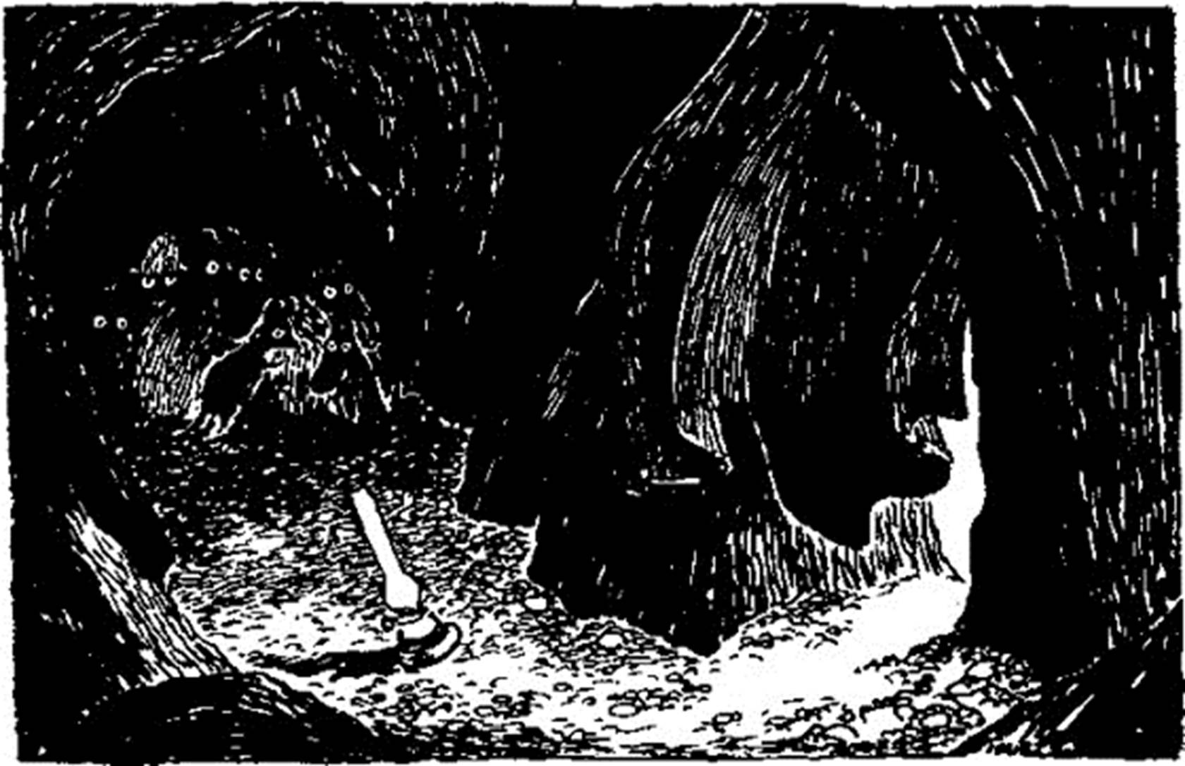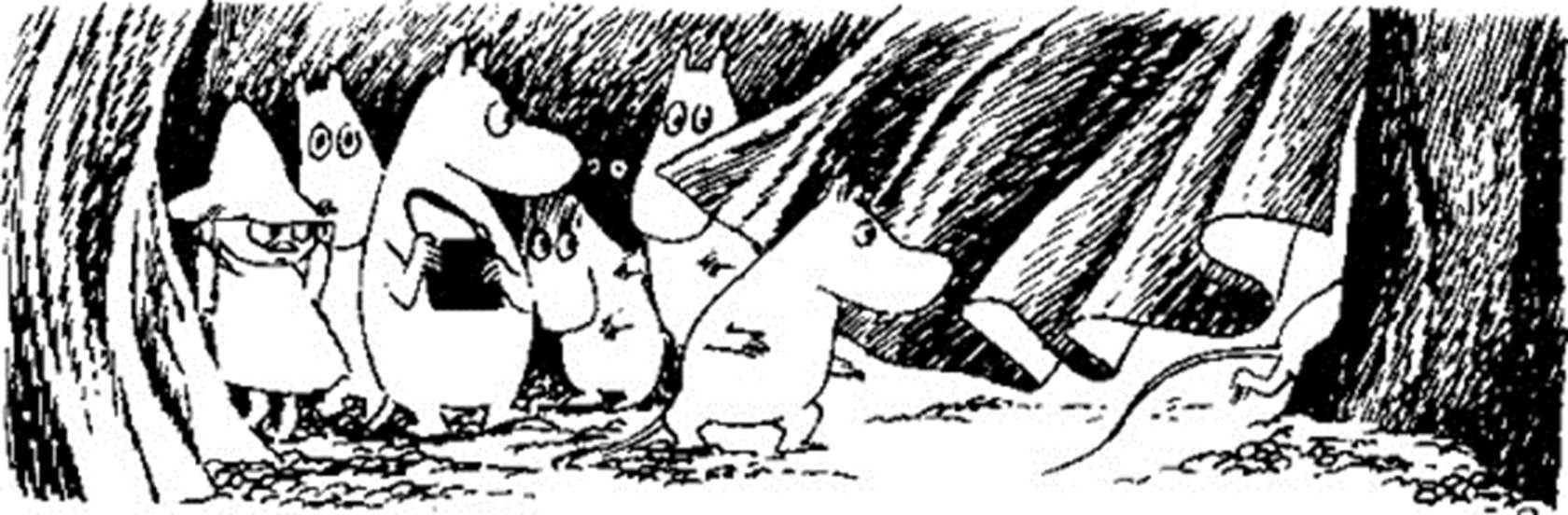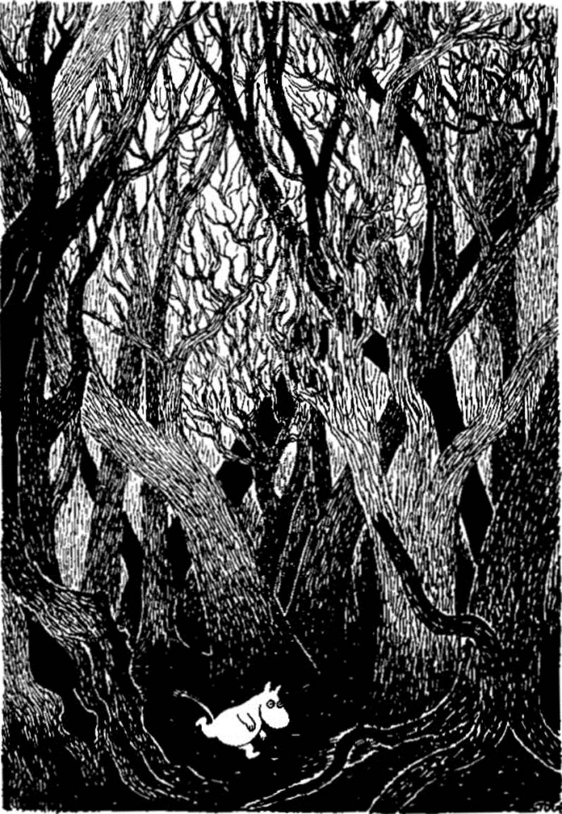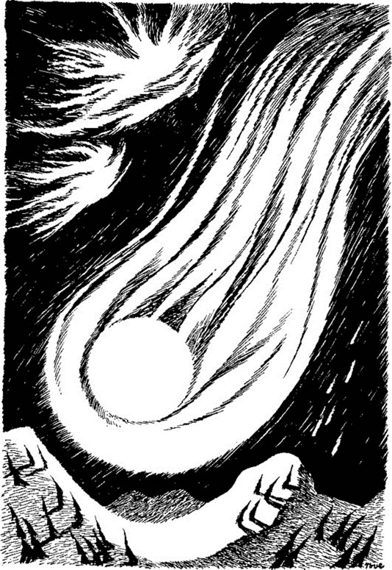 – Чому їх так довго немає? Уже майже пів на другу… – Скоро надійдуть, – вгамовувала його Мама. – Не хвилюйся! Підніми трохи торт, щоб я могла витягнути з-під нього кондитерський папір. Чмихові дамо облизати таріль, він це любить… Тато зітхнув і підняв торта. – Не треба було їх відпускати. Але хто ж знав… У цю мить до хатини увійшов Ондатр і вмостився на дров’яній скрині. – Як там комета? – поцікавилася Мама. – Летить щодуху! – похмуро буркнув Ондатр. – Знайшли ви час торти випікати!.. – Може, покуштуєте пиріжка? – запитала Мама Мумі-троля. – Ta-a, – завагався Ондатр. – Хіба одного, доки чекаємо… Після третього він сказав: – Здається, синок пані господині біжить через міст… У дуже строкатій компанії… – Мумі-троль?! – скрикнула Мама і випустила з лап тортову лопатку просто в смітник. – І ви тільки зараз кажете про це! Мама чимдуж вискочила надвір, Тато – услід. – Он наш синочок! А ото Чмих!.. А за ними – купа незнайомих Мамі й Татові істот. – Як я за тобою скучила! – цокотіла Мама Мумі-троля. – Ходи, я тебе обійму! Які ж бо ви змарнілі та брудні! Я так тішуся… Невже все це насправді! – Мамусю! Татусю! – захоплено розповідав Мумі-троль. – Я бився з отруйним кущем і переміг! Чах-чах – гілляки на всі боки, залишився сам пеньок! – Який ти хоробрий! – похвалила Мама. – А це хто? – Хропся, власне її я врятував від отруйного чортополоху! Ось Хропусь і мій найліпший друг Нюхмумрик. А це – Гемуль, який колекціонує поштові марки. Усі обмінялися потиском лапок. – Дуже цікаво, – мовив Тато Мумі-троля. – Колекціонування марок – надзвичайно благородне захоплення. – Це не захоплення, а мій фах, – буркнув Гемуль, який сьогодні не виспався. – Он як! – Тато зовсім не образився. – То вам, напевно, буде цікаво поглянути на альбом з марками, якого вчора принесло вітром? – Що?! – зойкнув Гемуль. – Справді, так воно й було, – потвердила Мама. – Я виставила надвір дріжджове тісто, щоб воно підросло, а вранці його обліпили бридкі маленькі липкі папірці. – Липкі папірці… – повторив Гемуль і зблід. – Заклинаю іменем усіх гемулів, де вони? Сподіваюся, ви їх не викинули? – Підсихають он там, – Мама Мумі-троля показала на білизняну шворку, нап’яту між двома кущами бузку. Побачивши свій червоний альбом для марок, Гемуль скрикнув від радості і притьмом кинувся до кущів, плутаючись у порваних торочках хламиди. – Щастить же декому, – Чмихові стало дуже гірко, бо кошеня не прийшло привітати його з поверненням додому. Він докірливо тицьнув лапкою на мисочку з молоком, яка стояла на ґанку: – А молоко скисло… – Спека всьому виною, – пояснила Мама. – Усе псується в таку спеку. Але інколи воно приходить посьорбати… Любі дітоньки, час попоїсти. Заходьте до хати і привітайтеся з Ондатром. Чмих залишився в саду. Він плазував попід кущами і кликав кошеня. Шукав у дровітні. Шукав усюди і кликав, кликав… Однак кошеня не прийшло. Чмих повернувся на ґанок, де все товариство саме снідало і розмовляло про комету. – Ондатр каже, що сьогодні увечері вона впаде простісінько на наш городець, – сказала Мама Мумі-троля. – І це саме тоді, коли мені врешті вдалося відчистити овочі від бридкої сизої пилюки… Тож я навіть не прополювала грядки… Невже Всесвіт справді чорний! Це ж ти, Чмиху, з’ясував? – Звичайно, – трохи повеселів Чмих. – Я все з’ясував… Коли прилетить комета, ми можемо заховатися у моїй печ