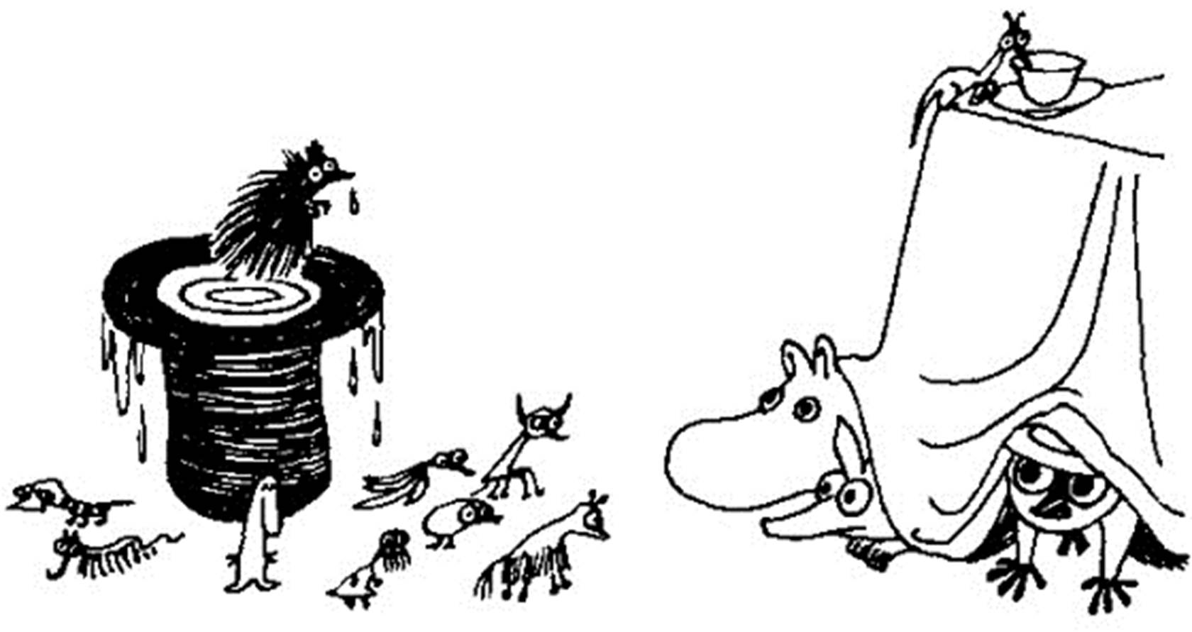 Одного тихого теплого дня, коли над Долиною Мумі-тролів сіявся літній дощик, друзі вирішили погратися у хованки вдома. Чмих став у куток, затуливши носа лапками, і голосно полічив до десяти, а тоді подався на пошуки. Спершу він зазирнув до звичних сховків, а потім і до незвичних. Мумі-троль лежав під столом на ґанку і почувався дуже незатишно. Схованку він собі знайшов погану. Чмих неодмінно зазирне під скатертину – тут він і попадеться. Мумі-троль роззирнувся на всі боки і враз помітив чорного капелюха, якого хтось поставив у кутку на ґанку. Ось чудове місце для схованки! Чмихові ніколи й на думку не спаде підняти капелюха. Мумі-троль швиденько порачкував у куток і натягнув капелюха на голову. Щоправда, той сягав йому лише до живота, але якщо скоцюрбитися і підібгати хвостика, то ніхто його не зауважить. Мумі-троль хихотів сам до себе, прислухаючись, як Чмих один по одному познаходив усіх решту. Гемуль – хто би сумнівався! – знову, мабуть, заповз під канапу – ніколи не може вигадати ліпшого місця для сховку. А тепер всі гасали по будинку, шукаючи Мумі-троля. Мумі-троль ще довго сидів би під капелюхом, якби не злякався, що друзям набридне його шукати. Він покинув свою схованку і, визирнувши з-поза дверей, гукнув: – Ку-ку! Чмих ошелешено витріщився на нього, а тоді мовив щось зовсім дивне: – Сам «ку-ку!» – Хто це? – прошепотіла Хропся. Решта лише похитали головами, не зводячи погляду з Мумі-троля. Бідолашний маленький Мумі-троль! У чарівному капелюсі він перемінився на чудернацьке звірятко. Усе, що в ньому було кругленького, стало тонким, а все маленьке розрослося до неймовірних розмірів. Та найкумеднішим було те, що тільки він сам не знав, який у нього тепер вигляд. – О, як ви здивувалися! – вигукнув Мумі-троль, невпевнено роблячи крок на своїх довгих хитких ніжках. – Ніколи не здогадаєтеся, де я був! – А нам те й байдуже, – пхикнув Хропусь. – У тебе такий чудернацький вигляд, що хто хоч здивується. – Дивні ви якісь, – засмутився Мумі-троль. – Певно, надто довго мене шукали… Чим займемося зараз? – Перш за все варто було б відрекомендуватися, – стримано зауважила Хропся. – Ми ж навіть не знаємо, хто ти… Мумі-троль вражено глянув на неї, але подумав собі, що то, напевно, нова гра, і радісно засміявся: – Я – Король із Каліфорнії! – А я – сестричка Хропуся, – мовила Хропся. – Це – мій брат. – Моє ім’я – Чмих. – А я – Нюхмумрик. – Які ж бо ви нудні! – буркнув Мумі-троль. – Невже важко придумати щось цікавіше? Ходімо надвір, там уже розпогоджується. Він подибав на ґанок, решта – за ним, здивовані і розгублені. – Хто це? – поцікавився Гемуль, котрий сидів перед будиночком і лічив тичинки соняшника. – Король із Каліфорнії, – у голосі Хропсі вчувався сумнів. – Оселиться у нас? – запитав Гемуль. – Це вирішувати Мумі-тролеві, – сказав Чмих. – Дивно, куди він запропастився? Мумі-троль розсміявся. – Але й потішними ви буваєте іноді! Бракувало тільки влаштувати розшуки Мумі-троля! – А ти його знаєш? – здивувався Нюхмумрик. – Ще би! Навіть дуже добре знаю! – Мумі-троля неймовірно захопила нова гра, він аж запишався, що так гарно вписався у неї. – Коли ти з ним познайомився? – не відступала Хропся. – Ми народилися водночас, – Мумі-троля мало не розпирало від веселощів. – Але то лобуряка, мушу вам сказати! Може вщент розтрощити порядний дім! – Не смій таке казати про Мум