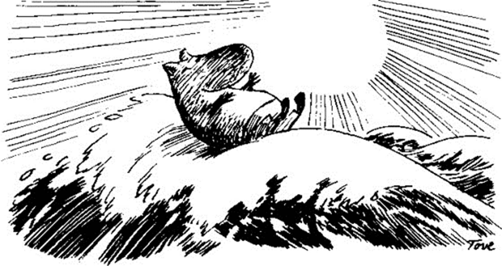 Хропся прокинулася посеред ночі з відчуттям огиди: щось торкнулося її личка. Вона не наважилася визирнути з-під ковдри, лише сторожко принюхалася. Пахло паленим! Хропся натягнула ковдру на голову й тихо покликала: – Мумі-тролю! Мумі-тролю! Мумі-троль вмить розплющив очі. – Що трапилося? – Серед нас якесь страхіття! – жебоніла злякано з-під ковдри Хропся. – Я відчуваю, що тут якесь страхіття! Мумі-троль вдивлявся у темряву. Так воно й було! Крихітні світелка… Бліді світляні тіні сновигали між поснулими. Мумі-троль розтермосив зі сну Нюхмумрика. – Поглянь, – прошепотів він вражено. – Примари! – Та ні, – заспокоїв його Нюхмумрик. – То гатіфнати. Гроза наелектризувала їх, от вони й світяться. Не рухайся, бо вдарить струмом! Гатіфнати, здавалося, щось шукали. Вони переворушили усі кошики, запах паленого посилився. Раптом маленькі істоти скупчилися в кутку, де спав Гемуль. – Вони його не поб’ють? – захвилювався Мумі-троль. – Гатіфнати шукають барометр, – збагнув Нюхмумрик. – Я ж казав йому не брати барометра! Ось вони його й знайшли! Спільними зусиллями гатіфнати тягнули барометра. Щоб зручніше ухопитися, вони вилізли на Гемуля, і тепер від запаху паленого аж у носі крутило. Прокинувся Чмих і зачмихав. Зненацька в курені розлігся чийсь рев. То один із гатіфнатів наступив Гемулеві на носа. Умить всі зірвалися на ноги. Зчинився неймовірний переполох. Тривожні запитання лунали впереміш із зойками, коли хтось, наступивши на гатіфната, обпікався або ж діставав удар струмом. Гемуль плутався під ногами, завиваючи від страху й тицяючись наосліп по кутках, аж доки налетів на полотнище вітрила й завалив куреня. Це було щось жахливе. Згодом Чмих стверджував, що вибиралися вони з-під вітрила щонайменше годину (можливо, він ледь переборщив). Коли всі нарешті звільнилися з-під намету, гатіфнати вже давно зникли у лісі разом з барометром. Ні в кого не виникло жодного бажання кинутися їм навздогін. Гемуль, зойкаючи, запхав носа у мокрий пісок. – Це вже занадто! – обурювався він. – Чому бідолашний безвинний ботанік не може жити у тиші й спокої?! – Життя – не тиха заводь, – задоволено зауважив Нюхмумрик. – Дощ ущух, – повідомив Мумі-тато. – Бачите, дітоньки? Небо розпогодилося. Скоро почне світати. Мама Мумі-троля тремтіла від холоду, міцно притискаючи до себе свою торбинку. Вона глянула на бурхливе нічне море й запитала: – Як вчинимо? Може, відбудуємо курінь і спробуємо ще поспати? – Не варто, – мовив Мумі-троль. – Ліпше позагортаємося в ковдри і зачекаємо сходу сонця. Усі посідали рядком на березі, попритулявшись один до одного. Чмих упхався посередині – йому здавалося, що так безпечніше. – Не повірите, який то був жах, коли хтось у темряві торкнувся мого обличчя, – розповідала Хропся. – Не зрівняти з грозою! Вони сиділи й дивилися, як над морем починає світати. Шторм уже вгамувався, однак великі хвилі все ще з ревом накочувалися на берег. Небо на сході зблідло, було страшенно холодно. І ось у цю передсвітанкову годину вони помітили гатіфнатів, котрі покидали острів. Човни один за одним, наче тіні, випливали з-за мису й виходили у відкрите море. – Прекрасно! – зрадів Гемуль. – Сподіваюся, вони ніколи більше не потраплять мені на очі… – Напевно, знайдуть собі інше місце для зібрань, – озвався Нюхмумрик. – Потайний острів, де їх ніхто не знайде! Тужним поглядом ди