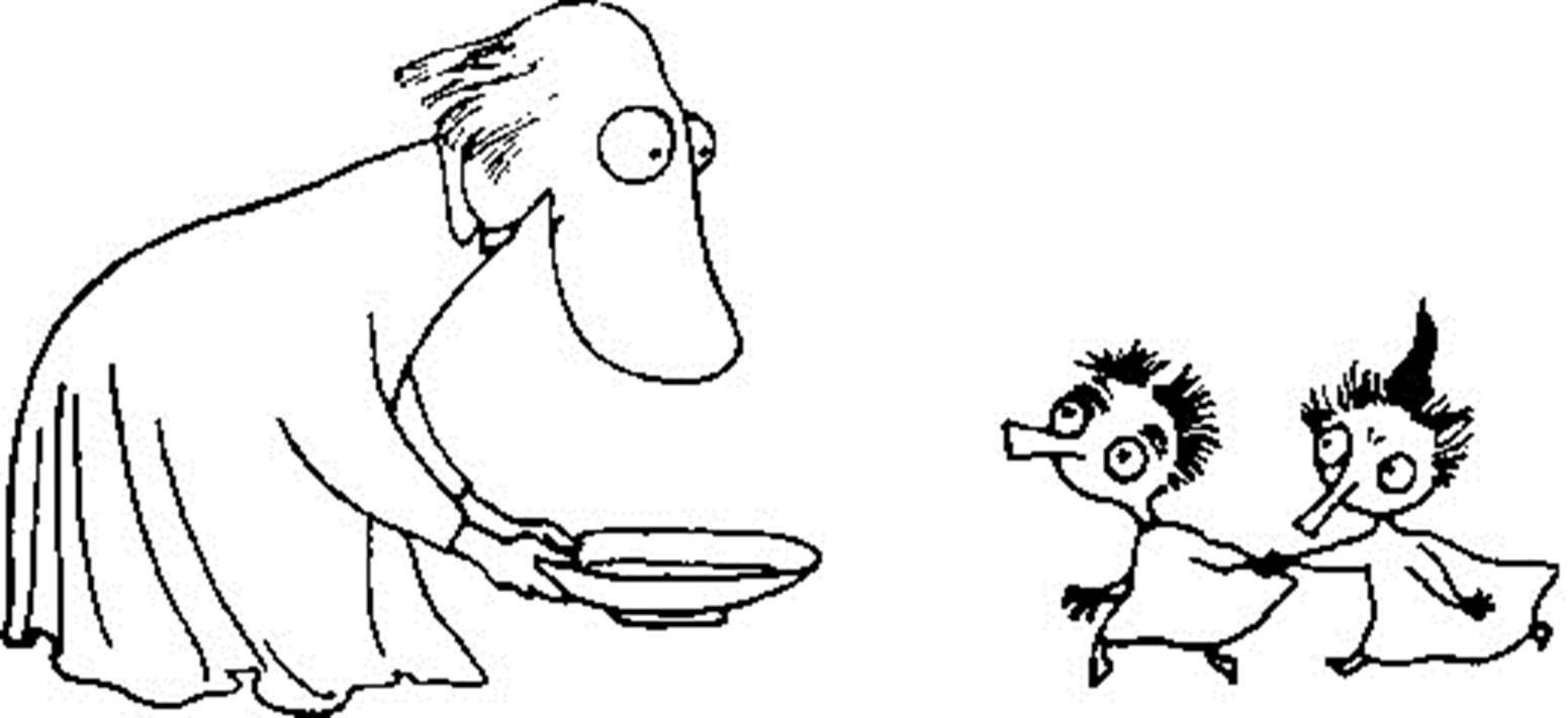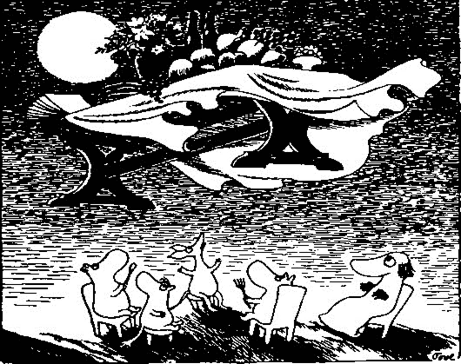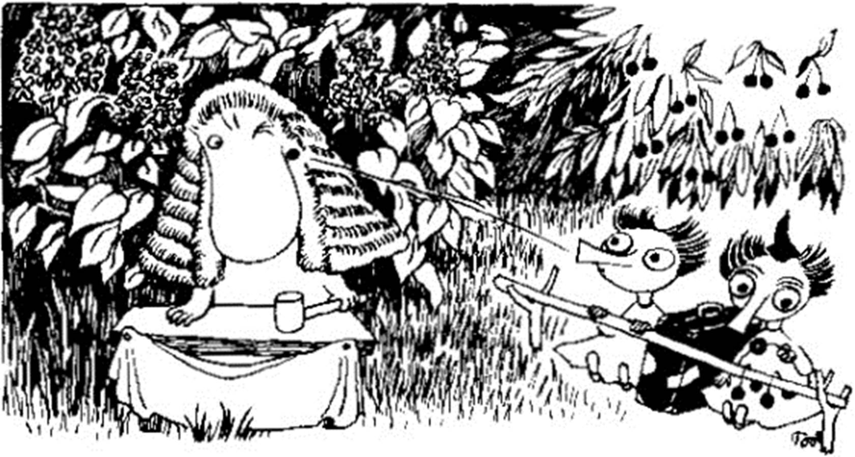 Одного раннього ранку на початку серпня мандрували горами Чупсля і Трясля[9] й опинилися приблизно у тому самому місці, де Чмих знайшов Чарівникового капелюха. Вони спинилася на вершині й задивилися на Долину Мумі-тролів. Чупсля мала на голові червону шапочку, а Трясля волокла велику валізку. Вони прийшли здалеку й дуже втомилися. Унизу з комина будиночка Мумі-тролів струменів вранішній дим. – Димсля, – мовила Трясля. – Щось готуютьсля, – кивнула голівкою Чупсля. Вони рушили в Долину, розмовляючи по дорозі чудернацькою мовою, яка є ужитковою для всіх чупслів і тряслів. Їх не всі розуміли, та головне, що між собою вони могли прекрасно порозумітися. – Гадаєшсля, нас впустятьсля? – засумнівалася Чупсля. – Хтознасля… – відказала Трясля. – Але не бійсясля, якщо нас зустрінутьсля непривітно. Вони сторожко підійшли до будинку і поставали знічено біля сходів. – Постукаємсля? – несміливо запитала Чупсля. – А раптом на нас накричатьсля? У ту мить Мама визирнула у вікно і голосно покликала: – Кава готова! Чупсля і Трясля так страшенно налякалися, що сторчголов заплигнули через віконце до льоху, де зберігалася картопля. – Ой, – зойкнула Мама і аж підскочила з переляку. – Напевно, двоє щуриків залізло до пивниці. Чмиху, віднеси їм трохи молока! Раптом вона помітила покинуту на сходах валізку. «О, та вони з багажем! – подумала вона. – Напевно, захочуть затриматися у нас на довше…» Мама рушила на пошуки Тата, щоб попросити його доставити ще два ліжка, але дуже-дуже маленькі. А тим часом Чупсля і Трясля принишкли в картоплі – лише очі виблискували – і зі страхом очікували, що ж буде з ними далі. – У кожномусля разі тут готують кавусля, – пробубоніла Трясля. – Хтось ідесля, – холонучи від ляку, зашепотіла Чупсля. – Сиди тихо, як мишасля! Двері льоху скрипнули, на верхній сходинці з’явився Чмих з ліхтариком в одній лапці і мисочкою молока в іншій. – Агов! Де ви? – покликав він. Чупсля і Трясля ще глибше зарилися в картоплю, міцно вчепившись одне в одного. – Хочете молока? – запитав Чмих уже голосніше. – Він хочесля нас обдуритисля, – шепнула Трясля. – Якщо гадаєте, що я стоятиму тут півдня, то дуже помиляєтеся, – почав уже сердитися Чмих. – Неподобство або безглуздя! Старі дурні щурі, яким забракло розуму увійти в дім з головного входу! Трясля не стерпіла образи власної гідності: – Сам тисля щурсля! – Ого, ще й чужоземці! – здивувався Чмих. – Ліпше покличу Маму Мумі-троля. Він замкнув двері льоху на замок і кинувся в кухню. – То що, попили гості молока? – запитала Мама. – Вони розмовляють чужинецькою мовою. Годі зрозуміти! – Ану, повтори якісь слова! – попросив Мумі-троль, який удвох з Гемулем розтирав у ступці прянощі. – Сам тисля щурсля! – пригадав Чмих. Мумі-мама зітхнула. – Тільки того ще бракувало. Як мені довідатися, що вони забажали б собі на десерт в день своїх уродин чи скільки подушок класти їм під голови? – Ми навчимося їхньої мови! – заспокоїв її Мумі-троль. – Це дуже просто! Разсля, двасля, трисля! – Здається, я зрозумів, що вони мали на увазі, – замислено мовив Гемуль. – Вони сказали, що Чмих старий лисий щур! Чмих почервонів по самі вуха й спересердя тріпнув головою. – Іди й сам поговори з ними, якщо такий мудрий! – чмихнув він. Гемуль почеберяв до льоху і покликав ласкавим голосом: – Ласкаво просимосля! Чупсля і Трясля виткнули голови з картопл