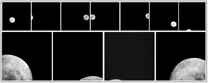 Вот три последовательных кадра из атласа [10], приписываемые астронавтам А‑8 (илл.22). Границы этих кадров в точности соответствуют оригиналам НАСА. Единственным объектом съёмки здесь является Земля. Поэтому логично ожидать, что астронавт расположит её в центральной части кадра. Но Земля не «слушается» и кадр получается кособоким. И таких кособоких снимков в атласе [10] – не менее сотни. Почему же далеко не всегда удаётся астронавтам держать Землю в центре кадра? Казалось бы, лёгкое движение руки – и Земля «на месте»? Теперь обратим свои взоры к Луне. Вот две последовательности снимков Луны (илл.23), которые, согласно НАСА, сделали своими «Хассельбладами» астронавты А‑14. И, что характерно, на илл.23 мы видим то же самое явление, что и на илл.22, только теперь уже Луна «не слушается» астронавтов и никак не хочет встать в центр кадра. Подчеркнём, что перед Вами не «намеренная» выборка неудачных кадров, а две серии последовательных кадров, взятых из атласа [10]. И таких серий в атласе можно увидеть много.