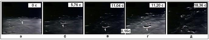 Вот вдали показалась тёмная граница света и тени, так называемый терминатор. У самого терминатора расположена структура в виде полукольца, отмеченная цифрой 1. Она поможет нам проследить за сменой света и тени. Вот местность вокруг полукольца быстро охватывает темнота. На илл.1а полукольцо 1 находится ещё на освещённом участке местности, а уже через 11 секунд оно погрузилось в почти полную темноту, и только гребни лунных валов ещё освещены (илл.10в). Столь быстрое потемнение очень любопытно, потому что на Луне ночь сменяет день очень медленно, так как Луна делает один оборот вокруг своей оси за 27 суток. Граница света и тени перемещается по лунному шару со скоростью всего 6 м/с. За 11 секунд она сместится всего на 70 м. И, если за эти 11 секунд тень накрыла ранее освещённый участок лунной местности, то и сам участок должен иметь размеры порядка десятков метров. Однако легко рассчитать, что с высоты 110 км, на которой согласно НАСА А‑8 пролетал над Луной, открывается вид с дальностью горизонта в 600 км.