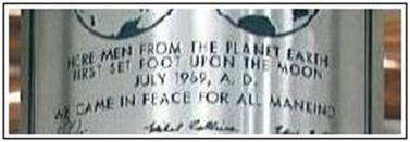 Надпись на капсуле, якобы оставленной на Луне на трапе лунного модуля А‑11. На памятном вымпеле, укреплённом на лунном модуле А‑11, начертано: «Мы пришли с миром от всего человечества» (илл.9). «Для всего человечества» – так назван юбилейный фильм НАСА [ф2]. На фоне этой трогательной заботы обо всём человечестве кажется несколько странным то, что в ходе шести экспедиций на Луну никому в НАСА не пришло в голову пригласить в полёт на Луну кого‑нибудь из представителей неамериканской части человечества. Можно понять то, что в первые полёты было не до таких дипломатических решений, но ведь их было шесть. После окончания полётов на Луну у американцев в запасе остались три ракеты «Сатурн‑5» и три командных модуля корабля «Аполлон» [20]. Самый дорогой полёт на Луну (А‑15) обошёлся в 445 млн. долларов [21, с. 235]. Если отсюда вычесть стоимость одной ракеты «Сатурн‑5» из имеющегося запаса ($431 млн. [22]), то на организацию международной экспедиции под эгидой США потребовался бы сущий пустяк – $14 млн… Это уж человечество вскладчину, как‑нибудь, осилило бы. Но, никто из представителей граждан других стран не может засвидетельствовать хотя бы одну из шести объявленных высадок на Луну. «Чужих» на Луну не брали (илл.10). А, надо сказать, что некоторые интересные традиции американцев в области великих открытий дают повод желать независимых свидетелей их великих свершений. В качестве примера во Введении приведена история «покорения» Северного полюса американцем Пири. Он тоже предпочёл не иметь нежелательных свидетелей этого «покорения» и отослал назад единственного квалифицированного попутчика, который мог самостоятельно определить географические координаты, – капитана Р. Бартлета. Как выразился автор [23], «американской науке не привыкать к фальсификациям». Поэтому независимые свидетели на Луне помогли бы развеять сомнения в том, что «лунопроходцы» пошли по следам своего знаменитого соотечественника – «полюсопроходимца». Однако, как и во времена Пири, американские пионеры освоения Луны решили, что великое достижение не требует посторонних свидетелей.