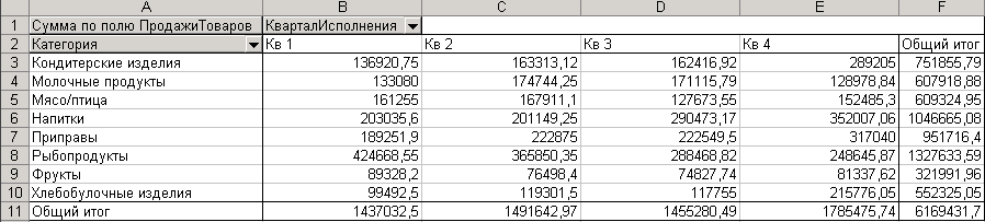 15-шi сурет. Жинақ кестенiң құрастыруын облыс. 1.Бағаналардың төңiрегiдегi орындауды тоқсан, жолдардың төңiректерiңiздегiн өрiстi апарыңыз - дәреже, мәлiметтердiң төңiректерiдегiн өрiс - тауарлардың сатуы. (16-шы сурет қара) жинақ кесте нәтижеде алады.