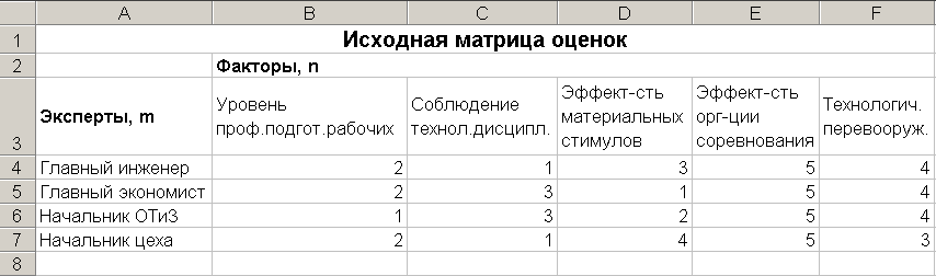 Өндіріс өнімділігі бойынша жоспарды жасау барысында (әсіресе,еңбек өнімділігін жоғарылатуда) өндірістің өнімділігіне әсер етуші факторлардың әсер ету деңгейін анықтау мәселесі туындайды. Мұндац мәселелердің шешімін табу үшін Эксперттік бағалау әдісін қолдану ұсынылады.Бұл әдіс арнайы бір математикалық жолмен теңдеулер арқылы көрсетуге келмейтін есептерді шешуде қоланылады.Мұндай есептер құрылымы жоқ деп аталады. Біздің жағдайда эксперттік бағалау әдісі қолданылады,мағынасы ары қарай түсіндіріледі. Мысалы,еңбек өнімділігінің өсуіне әсер ететін факторлардың әсер ету деңгейін бағалау қажет болсын: 1) қызметкерлердің кәсіби біліктілігінің деңгейі; 2) технологиялық тәртіптің сақталуы; 3) материалдық ынталандырудың әсерлілігі; 4) ұйымның бәсекелестігінің әсерлілігі; 5) технологиялық қамсыздандыру. Еңбек өнімділігінің өсуіне әсер ететін факторлардың деңгейін бағалайтын, эксперттер ретінде келесідей арнайы кәсіпорындар жұмыс істейді: 1) басинженер; 2) бас экономист; 3) ОТжЗ бастығы; 4) цехтардың бірінің басшысы. Эксперттердің санын мынадай етіп белгілейміз: m (m = 4). Бағаланатын факторлардың саны - n (n = 5). Жұмыстың орындалуы: 1. MS Excel-де келесідей етіп кесте сызып, Таңдау әдісі деген атаумен папкаға сақтаңыз